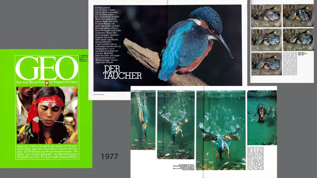 So gelang es mir 1975 die damals weltweit ersten Unterwasserfotos eines tauchenden Eisvogels zu machen, die ich 1977 in GEO publizierte.